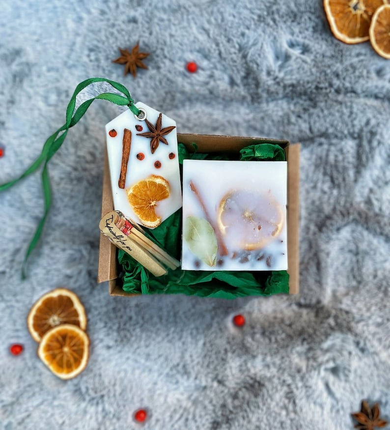 Beautiful handmade candle gift box set with natural ingredients. Large Candle with matches in a glass jar and aroma soy wax sachet .Filling your home with an aroma you love is an instant way to boost your mood. Delicately sweet cinnamon lead into notes of citrus orange zest .