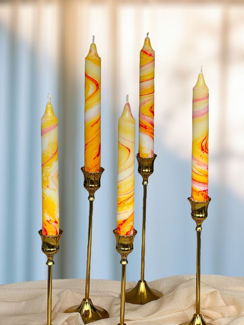 Each of these candles is individually handmade. These are hand-poured, and then hand-dipped to give them a unique marbled effect.